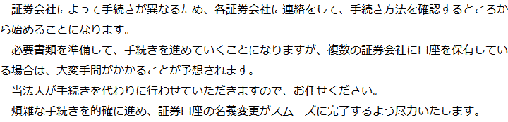 トップ業務内容証券口座の解約・名義変更 階層構造▼ 業務内容(目次) 証券口座の解約・名義変更 業務内容(目次)業務内容トップ行政書士法人心の業務内容遺言遺産整理相続人調査相続財産調査遺産分割協議書の作成預金・貯金の解約・名義変更証券口座の解約・名義変更自動車の名義変更心グループのその他の業務内容家族信託・民事信託節税対策事業承継遺言の検認相続放棄限定承認遺産分割遺留分侵害額請求相続登記相続税申告相続税調査 受付時間 平日 9時~21時、土日祝 9時~18時 夜間・土日祝の相談も対応します (要予約) 所在地 〒359-1123 埼玉県所沢市日吉町9-23TRN所沢4F 0120-2403-39 お問合せ・アクセス・地図