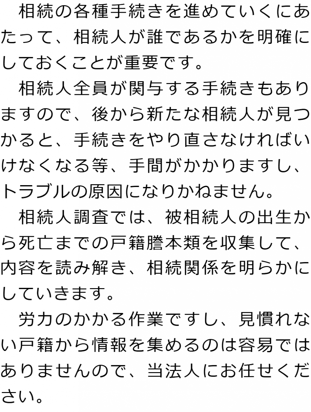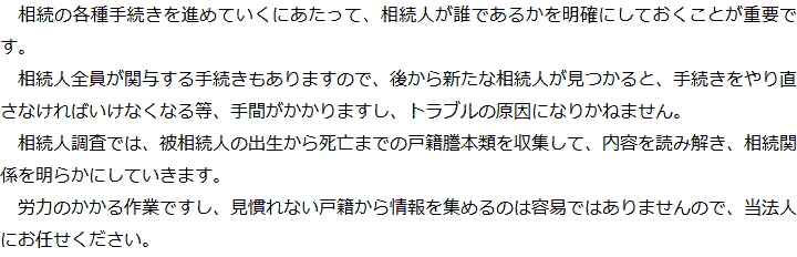 トップ業務内容相続人調査 階層構造▼ 業務内容(目次) 相続人調査 業務内容(目次)業務内容トップ行政書士法人心の業務内容遺言遺産整理相続人調査相続財産調査遺産分割協議書の作成預金・貯金の解約・名義変更証券口座の解約・名義変更自動車の名義変更心グループのその他の業務内容家族信託・民事信託節税対策事業承継遺言の検認相続放棄限定承認遺産分割遺留分侵害額請求相続登記相続税申告相続税調査 受付時間 平日 9時~21時、土日祝 9時~18時 夜間・土日祝の相談も対応します (要予約) 所在地 〒359-1123 埼玉県所沢市日吉町9-23TRN所沢4F 0120-2403-39 お問合せ・アクセス・地図
