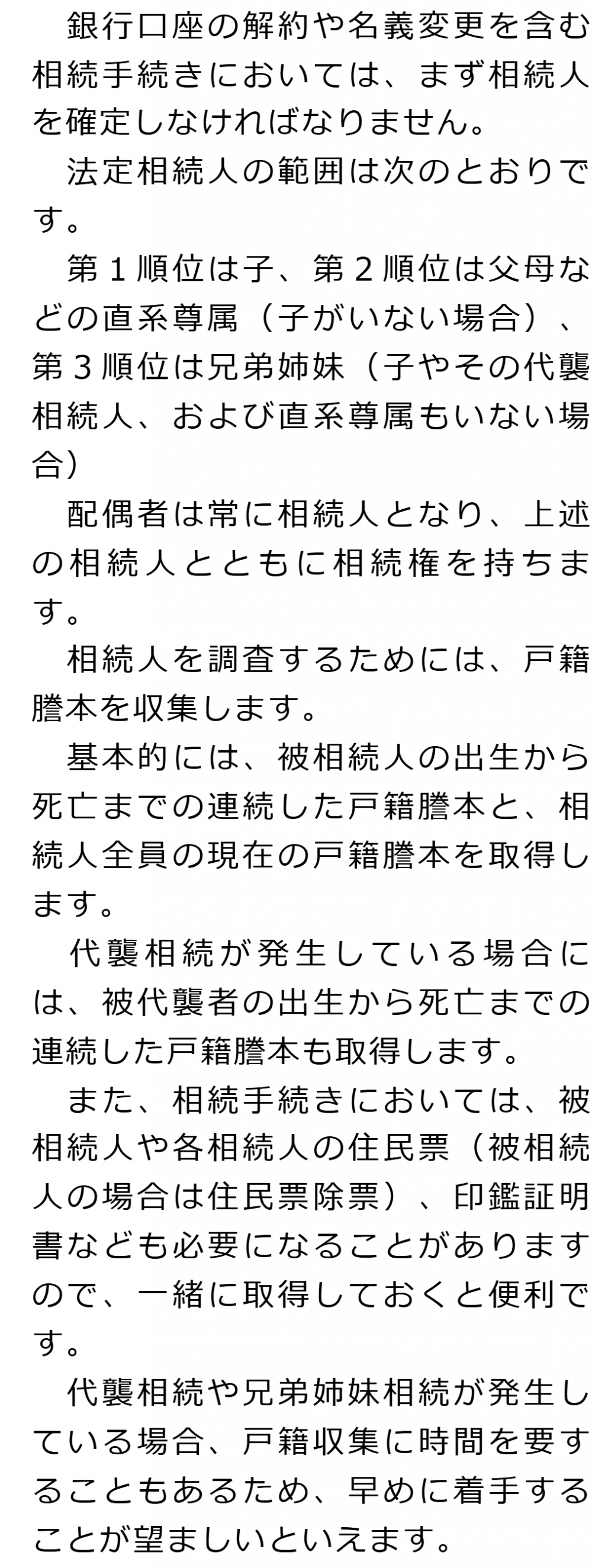 1 銀行口座の相続手続きの概要 2 相続人を確定する(相続人調査) 3 預貯金を含めた相続財産を把握する(相続財産調査) 4 相続人全員で分け方を決める(遺産分割協議) 5 金融機関における預貯金の解約・名義変更 6 相続手続きは専門家に相談・依頼することをおすすめします