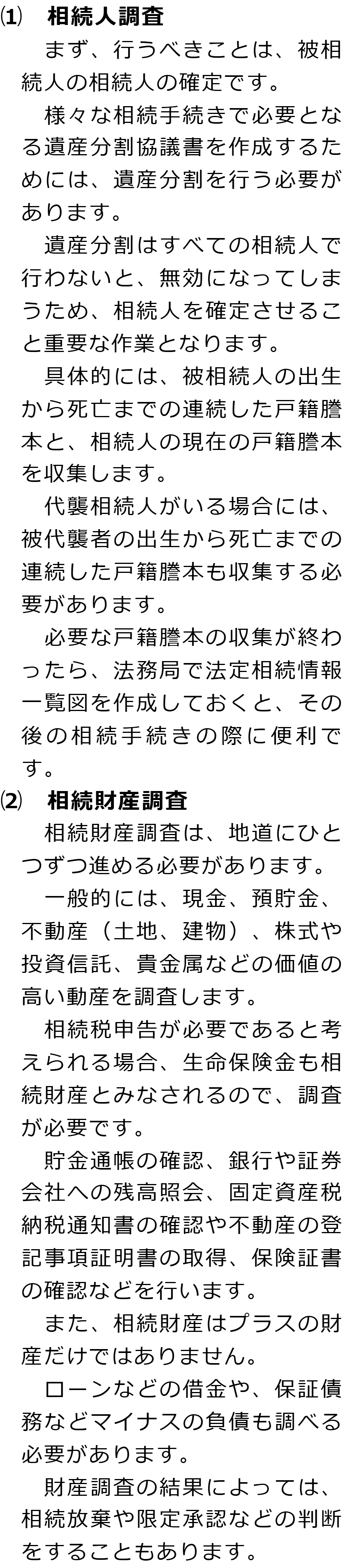 相続手続きの必要事項に関するQ&AQ相続手続きでは何をする必要がありますか?Q相続人調査と相続財産調査では何をする必要がありますか?Q遺産分割では何が必要ですか?Q相続登記はどのような場合に必要ですか?Q相続税申告はどのような場合に必要ですか? Q相続手続きでは何をする必要がありますか?AQ相続人調査と相続財産調査では何をする必要がありますか?AQ遺産分割では何が必要ですか?AQ相続登記はどのような場合に必要ですか?AQ相続税申告はどのような場合に必要ですか?A Q&A(目次)Q&Aトップ相続手続きの必要事項に関するQ&A 受付時間 平日 9時~21時、土日祝 9時~18時 夜間・土日祝の相談も対応します (要予約) 所在地 〒359-1123 埼玉県所沢市日吉町9-23TRN所沢4F 0120-2403-39 お問合せ・アクセス・地図