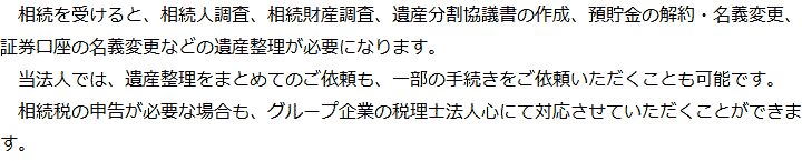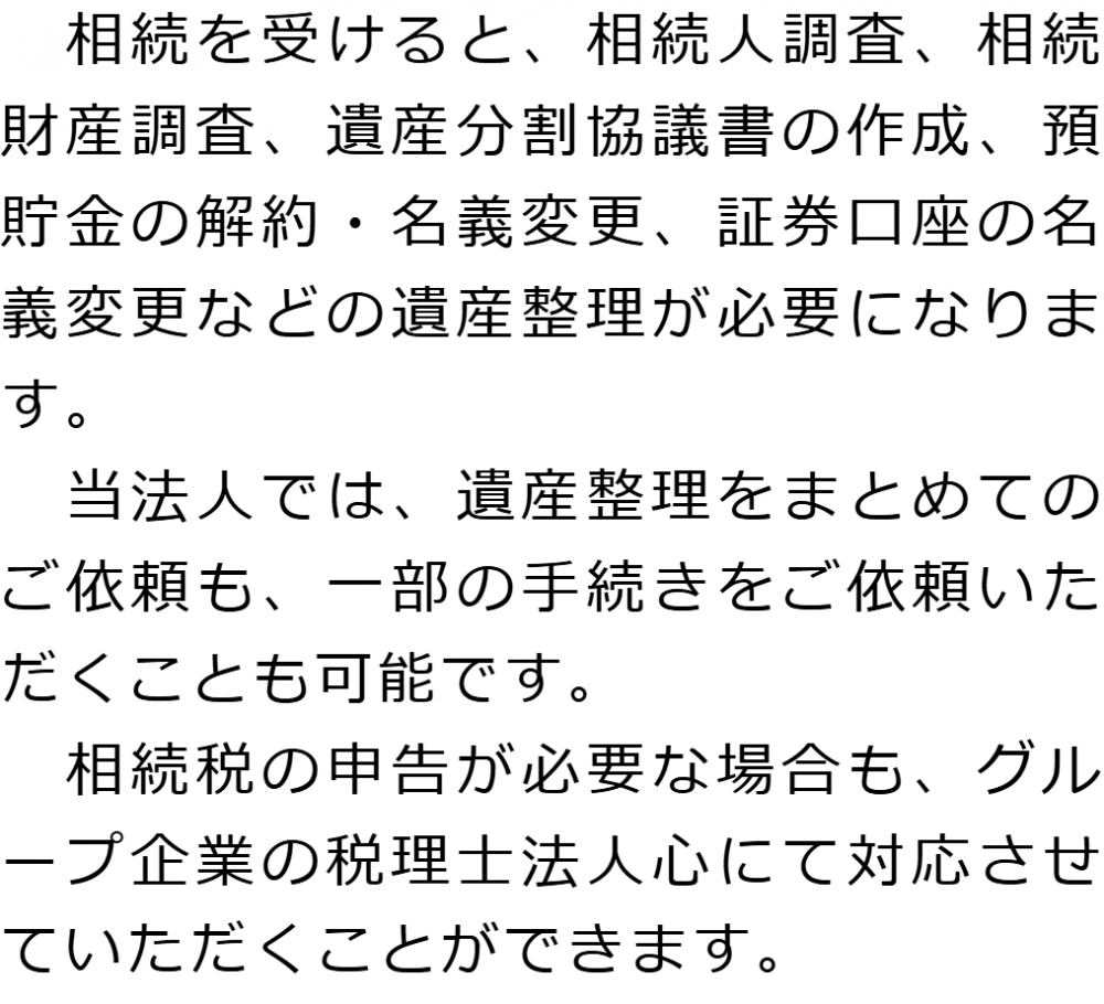 トップ業務内容遺産整理 階層構造▼ 業務内容(目次) 遺産整理 業務内容(目次)業務内容トップ行政書士法人心の業務内容遺言遺産整理相続人調査相続財産調査遺産分割協議書の作成預金・貯金の解約・名義変更証券口座の解約・名義変更自動車の名義変更心グループのその他の業務内容家族信託・民事信託節税対策事業承継遺言の検認相続放棄限定承認遺産分割遺留分侵害額請求相続登記相続税申告相続税調査 受付時間 平日 9時~21時、土日祝 9時~18時 夜間・土日祝の相談も対応します (要予約) 所在地 〒359-1123 埼玉県所沢市日吉町9-23TRN所沢4F 0120-2403-39 お問合せ・アクセス・地図