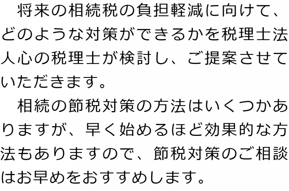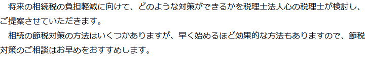 トップ業務内容節税対策 階層構造▼ 業務内容(目次) 節税対策 業務内容(目次)業務内容トップ行政書士法人心の業務内容遺言遺産整理相続人調査相続財産調査遺産分割協議書の作成預金・貯金の解約・名義変更証券口座の解約・名義変更自動車の名義変更心グループのその他の業務内容家族信託・民事信託節税対策事業承継遺言の検認相続放棄限定承認遺産分割遺留分侵害額請求相続登記相続税申告相続税調査 受付時間 平日 9時~21時、土日祝 9時~18時 夜間・土日祝の相談も対応します (要予約) 所在地 〒359-1123 埼玉県所沢市日吉町9-23TRN所沢4F 0120-2403-39 お問合せ・アクセス・地図