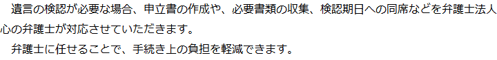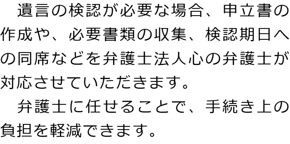 トップ業務内容遺言の検認 階層構造▼ 業務内容(目次) 遺言の検認 業務内容(目次)業務内容トップ行政書士法人心の業務内容遺言遺産整理相続人調査相続財産調査遺産分割協議書の作成預金・貯金の解約・名義変更証券口座の解約・名義変更自動車の名義変更心グループのその他の業務内容家族信託・民事信託節税対策事業承継遺言の検認相続放棄限定承認遺産分割遺留分侵害額請求相続登記相続税申告相続税調査 受付時間 平日 9時~21時、土日祝 9時~18時 夜間・土日祝の相談も対応します (要予約) 所在地 〒359-1123 埼玉県所沢市日吉町9-23TRN所沢4F 0120-2403-39 お問合せ・アクセス・地図