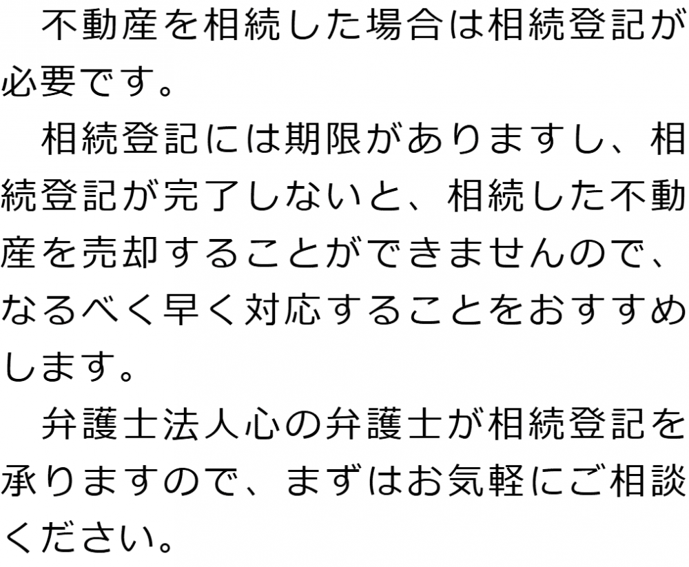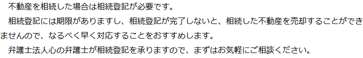 トップ業務内容相続登記 階層構造▼ 業務内容(目次) 相続登記 業務内容(目次)業務内容トップ行政書士法人心の業務内容遺言遺産整理相続人調査相続財産調査遺産分割協議書の作成預金・貯金の解約・名義変更証券口座の解約・名義変更自動車の名義変更心グループのその他の業務内容家族信託・民事信託節税対策事業承継遺言の検認相続放棄限定承認遺産分割遺留分侵害額請求相続登記相続税申告相続税調査 受付時間 平日 9時~21時、土日祝 9時~18時 夜間・土日祝の相談も対応します (要予約) 所在地 〒359-1123 埼玉県所沢市日吉町9-23TRN所沢4F 0120-2403-39 お問合せ・アクセス・地図