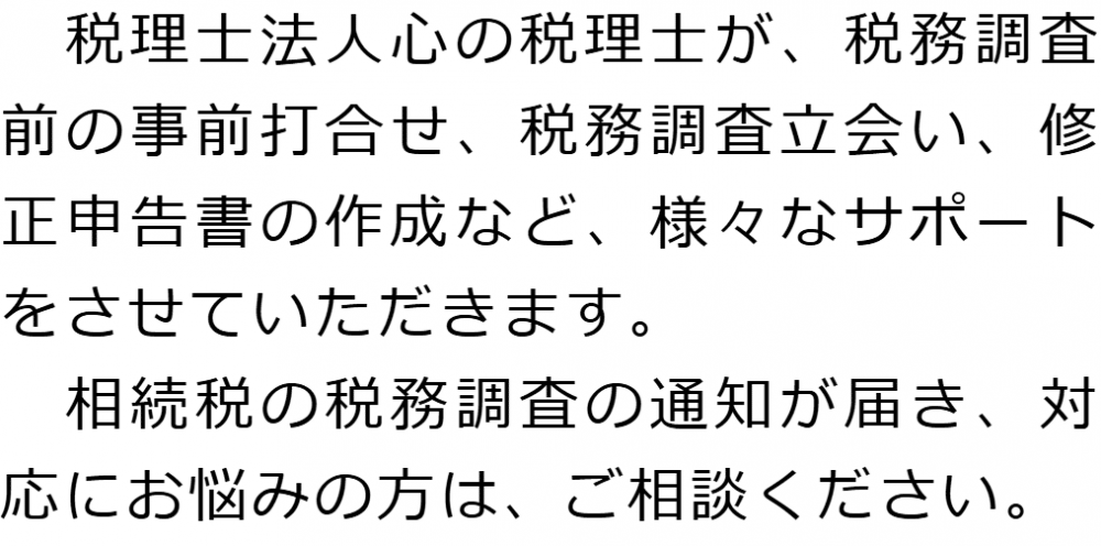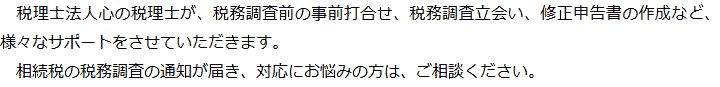 トップ業務内容相続税調査 階層構造▼ 業務内容(目次) 相続税調査 業務内容(目次)業務内容トップ行政書士法人心の業務内容遺言遺産整理相続人調査相続財産調査遺産分割協議書の作成預金・貯金の解約・名義変更証券口座の解約・名義変更自動車の名義変更心グループのその他の業務内容家族信託・民事信託節税対策事業承継遺言の検認相続放棄限定承認遺産分割遺留分侵害額請求相続登記相続税申告相続税調査 受付時間 平日 9時~21時、土日祝 9時~18時 夜間・土日祝の相談も対応します (要予約) 所在地 〒359-1123 埼玉県所沢市日吉町9-23TRN所沢4F 0120-2403-39 お問合せ・アクセス・地図